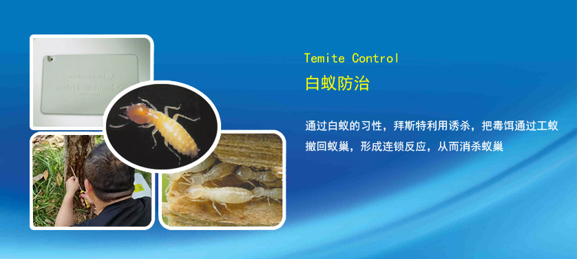拜斯特白蚁防治:通过白蚁的习性,利用诱杀,把毒饵通过工蚁搬回蚁巢,形成连锁反应,从而消杀蚁巢。